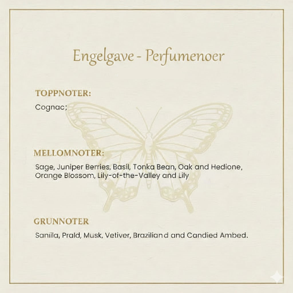 Duften åpner seg med en unik og edru start, hvor den rike, dyrebare tonen fra kognak (cognac) gir en umiddelbar følelse av luksus og varme. I hjertet av Engelgave kommer en kompleks krydret sammensetning frem, hvor den varme og aromatiske nyansene fra kanel og tonkabønner blander seg med treaktig eik (oak) og den moderne "søtlige" molekylet hedione. Dette skaper en dybde som er både mystisk og innbydende.