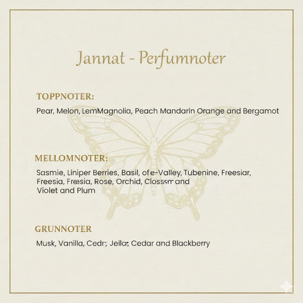 I hjertet av Jannat avslører en frodig og luksuriøs hage av blomster. Her kommer den tidløse og romantiske sjarmen fra jasmin til syne, sammen med den delikate duften av liljekonvall. Den intense og kremete sødmen fra tuberose og den lette floraliteten fra freesia flettes sammen med en rik bukett bestående av rose, orkide, fiol (violet) og plomme. Denne komplekse floralblendingen skaper en sjarmerende og sofistikert kjerne som er uimotståelig.