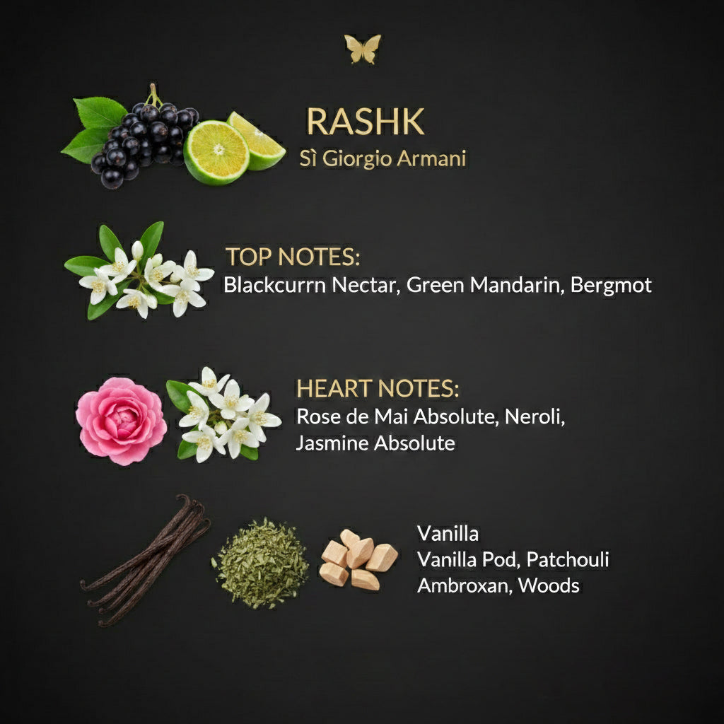 Duften åpner seg med en frisk og livlig tone av solbær (cassis), som gir en fruktig og inviterende start som umiddelbart vekker sansene. Hjertet av Rashk er en ren florale symfoni, der den delikate og kongelige duften av majrose smelter sammen med den friske og elegante freisia. Dette skaper en sjarmerende og feminin kjerne som er vanskelig å motstå. Basen avslutter reisen med en varm og behagelig sammensetning av søt vanilje, jordnær patchouli, treaktige noter og den moderne, silkemyke touchen fra ambroxan. Dette sikrer en langvarig og minneverdig sillage som varer hele dagen.