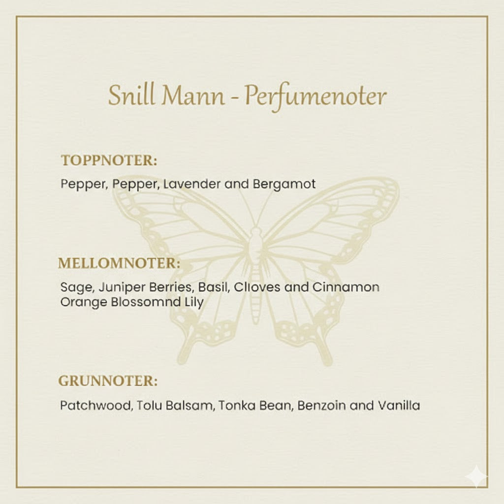 Basen er det som definerer Snill Mann som en sjelden perle. Her finner du en subtil og herlig nyanse av whiskey, som gir en edruelig og maskulin karakter. Denne flettes sammen med jordnære treaktige noter og varm rav (amber), som sikrer en sillage som er både langvarig og minneverdig. Perfekt for både hverdagsbruk og spesielle kvelder.